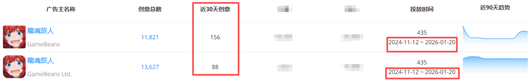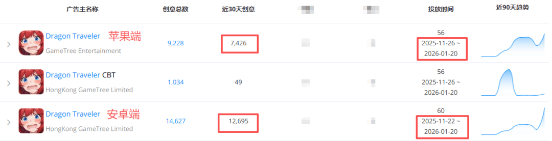 其次是投放方面的给力,该作提前一个半月(11月中下旬)开始进行小规模买量,公测前夕量级才全面拉升,近期谷歌端的投放明显开始高于苹果端,前者近30天广告创意总数高达12695,后者则为7426。在市场选择上,对于日韩市场的投入高于美国。素材上,与上线中国港澳台时基本保持一致,突出游戏福利、吸人眼球的美女角色展示以及轻松的玩法体验。