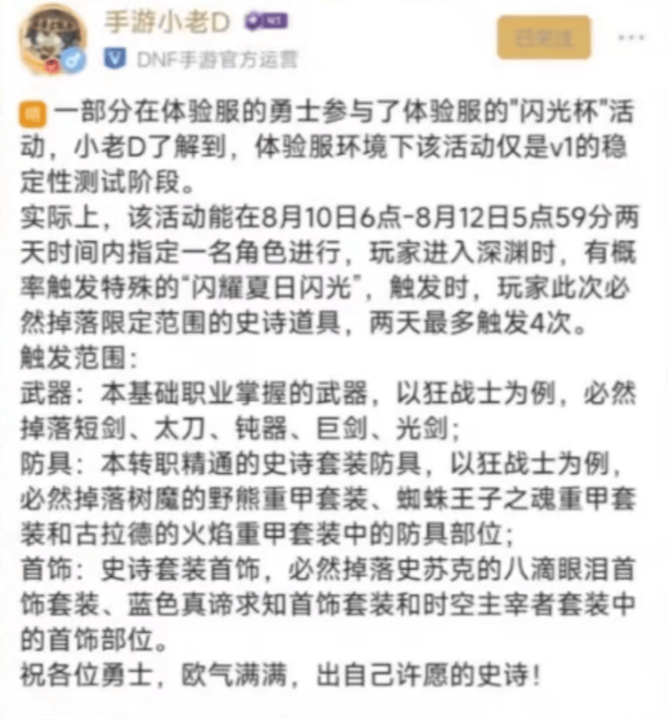 这个活动的性质不是许愿,但是也能加速毕业,选定角色在进入深渊时有概率触发夏日闪光,两天最多只能触发四次闪光,有点类黄蓝柱子,但是还要更强,蓝柱子是只会出能带的武器 ,意首饰和任意防具,而夏日闪光只会出现本职业的武器,套装首饰以及专精的套装防具。