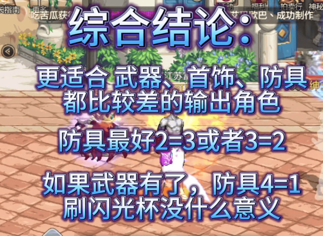 综上所述,就是闪光杯更适合武器首饰防具都比较差的输出角色,防具最好是二缺三或者是三缺二,如果说你武器已经有了,防具是四等一那么刷闪光杯基本没什么意义,找出你缺的那件装备就相当于是大海捞针,所以说就是距离毕业越近越不应该去刷闪光杯,因为你刷了也基本上不会有任何的提升,四等一的还不如去刷普通的深渊,用碎片的方式给制作出来。
