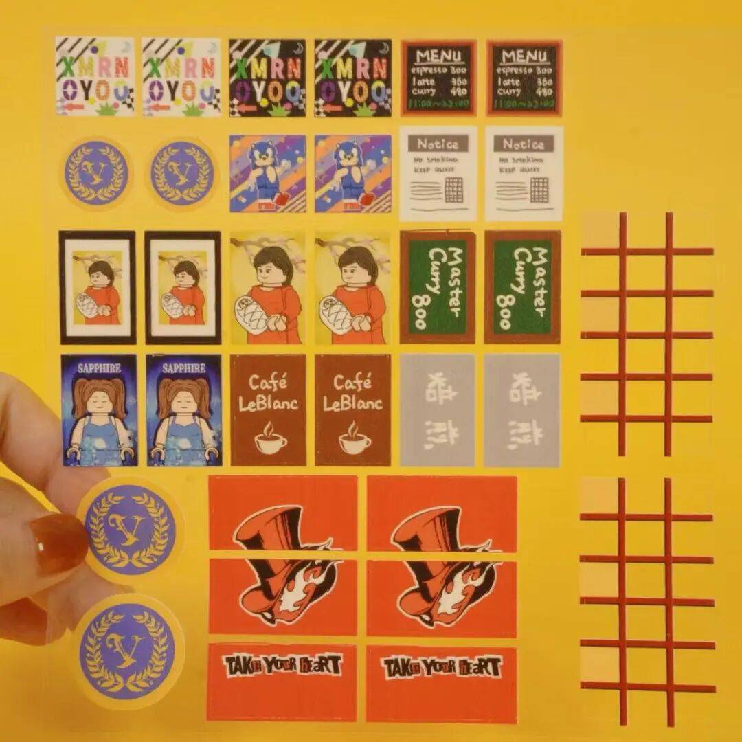 人仔共 8 个,分别是主人公 /Joker/雨宫莲 / 来栖晓、坂本龙司、摩尔加纳、高卷杏、喜多川祐介、新岛真、佐仓双叶、奥村春。发型都是乐高已有的模具,可惜部分颜色乐高还没出过,不然很想组装出实体人仔。