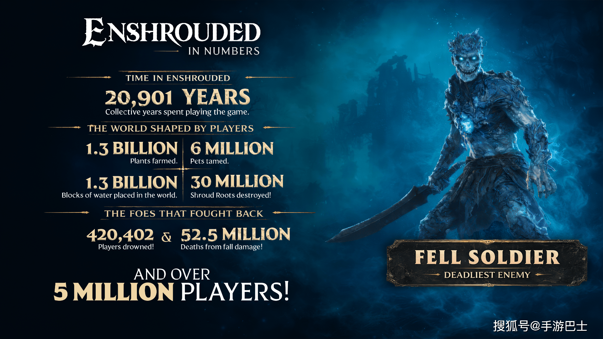 今日,Keen Games满怀激动(且带着一丝丝紧张)地告知各位:请期待2026年秋季《雾锁王国》正式版的发布。抢先体验开启后的爆发式成功,让团队有能力去执行并拓展《雾锁王国》最初的构想,而2026年下半年正是实现这一愿景的理想时机。1.0版本的发布并非终点,而是持续开发的全新篇章——后续还将有更多的优化、新增内容等。如果没有超过500万名玩家的支持,这段旅程绝无可能实现。开发团队再次向所有通过游戏、反馈和参与社区来添砖加瓦、添柴加火的火之子们致以诚挚的谢意。以下是收集到的一些令人惊叹的游戏数据: