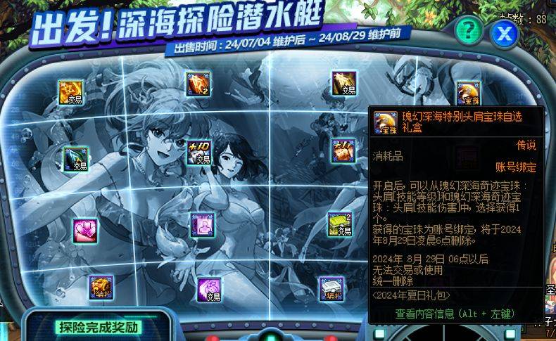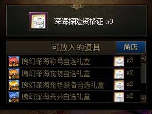深海探险资格证可用夏日礼包内的称号、宠物、宠物装备、光环、纹章以3、2、2、2、1的比例进行兑换。