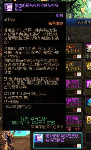 辅助装备和称号附魔宝珠,则需要在NPC汪汪潜水艇处用深海探险资格证进行兑换,每个需要15个深海探险资格证。
