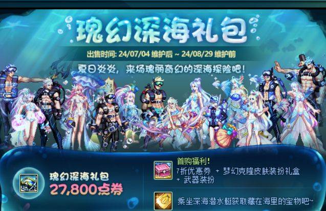 勇士们购买首套夏日礼包时,可以获得1个梦幻克隆皮肤装扮礼盒。勇士们若是资源充足,可以在NPC汪汪潜水艇处兑换精致的稀有克隆皮肤装扮变换器对其升级,获得毕业的皮肤装扮。