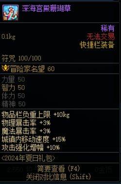 纹章一直是夏日礼包的核心提升点之一,几乎每年夏日礼包里面的纹章都是当年最强的。今年纹章的属性为30三攻/50四维、3%暴击、10攻击强化增幅,虽然对比前两年没什么变化,但同样也是毕业纹章。勇士们的角色若是没有纹章装备,可以考虑入手一个。