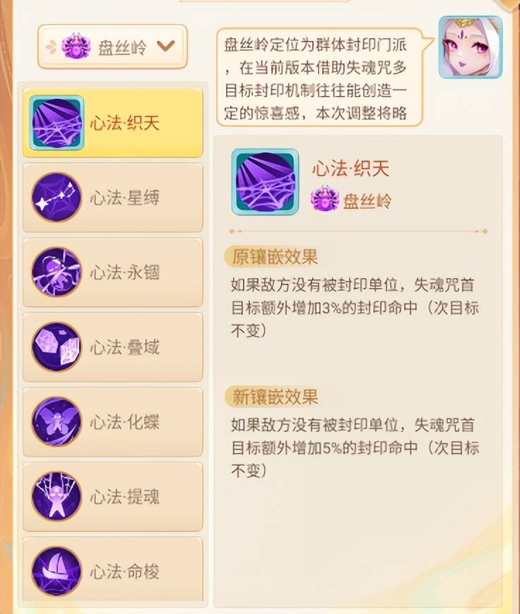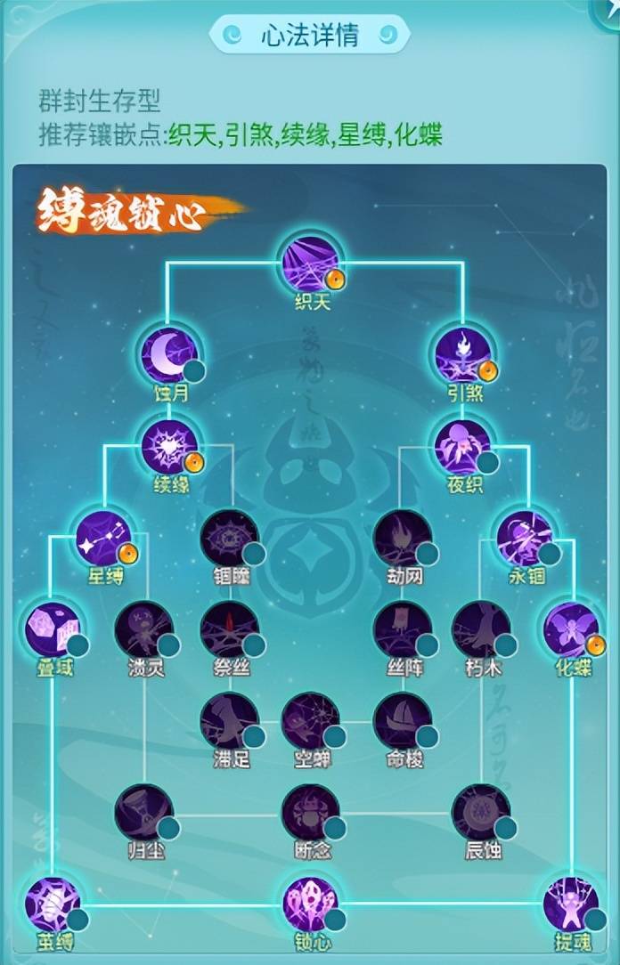 在心法这块,游戏里面已经设置了十分明显的建议,这里通常是使用推荐度最高的心法就行。比如,盘丝的缚魂锁心高达75%,大家便可大胆启用。玉琼可着重在织天、引煞、续缘、星缚、化蝶这些部位镶嵌。