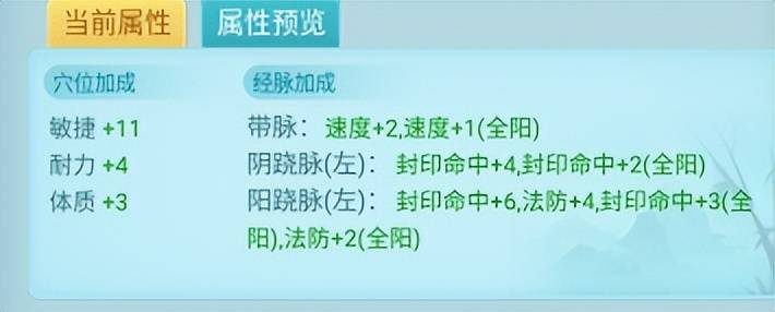 盘丝的经脉以堆速度+封印命中为主,其中帝脉为:1体1耐2敏(全阳),阴跷脉:6敏(全阳),阳跷脉:3敏3耐2体(全阳)。经脉属性点以洗练丹转换,阴阳效果则需在商城购买两仪石转换。