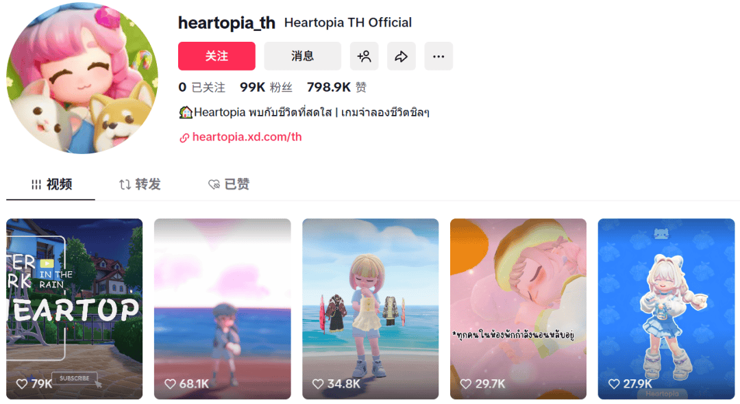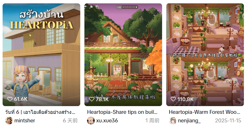 比如超过2000万粉丝的泰国头部KOL「zbing.z」便在游戏里还原了泰式酒店,随后她制作的相关视频在泰国社群里风靡,无数玩家都在分享《心动小镇》的衍生内容。