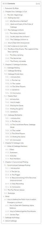 这个各方面都很像现实cult的组织,有自己的宗教仪式,名为“卷心菜轰炸”。他们会成立一个多人小队,同时空降到地图上的某处,然后飞速地把背包中的卷心菜全拿出来,铺满游戏的每个格子,同时大喊:“KAH-BAH-GEE!!!”