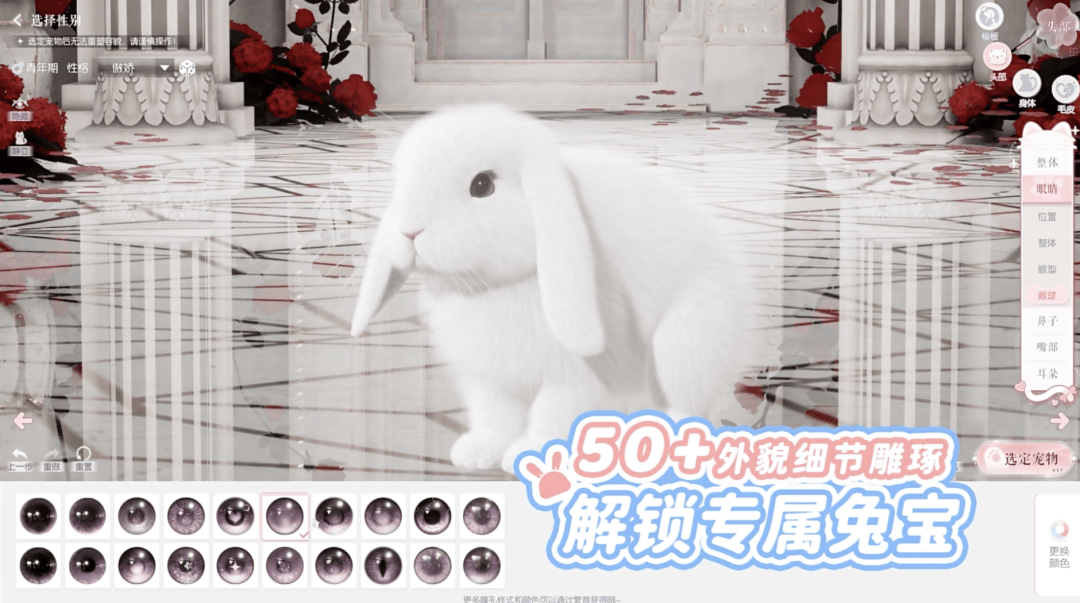 《以闪》的萌宠系统也在逐步更新:从一周年的小猫小狗,又新增了小兔子,捏脸的选项多达50余种。