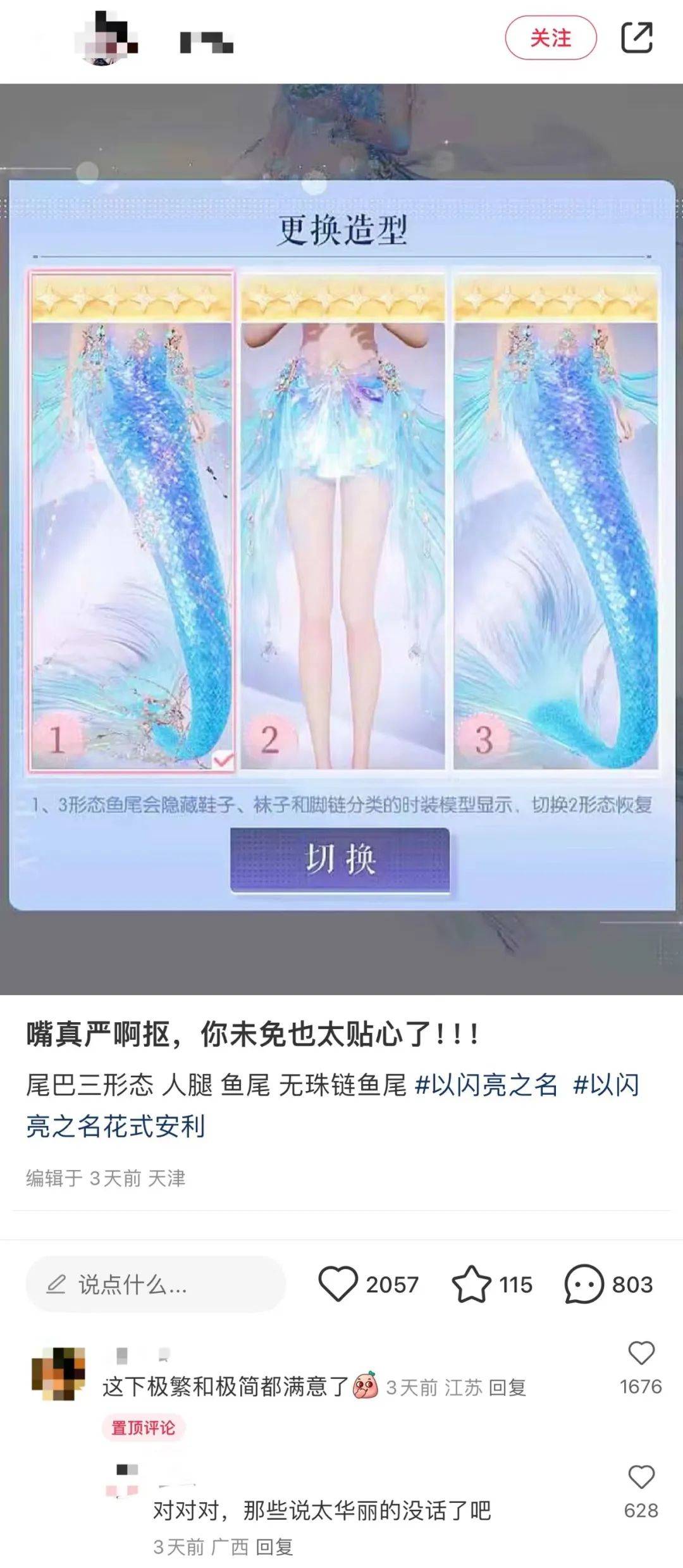 她们夸了《以闪》这次做了人鱼的三个形态:鱼尾加华丽装饰、鱼尾精简装饰、双腿装饰鱼鳞。三种形态,让极简、极繁的玩家都能满意。