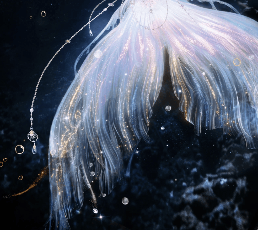 鱼鳍和鱼尾的形态设计,参考了幻彩斗鱼。鱼鳍褶皱还有虚实变化的设计,不同位置的鱼鳍闪粉的流光形态、消散的方向各不相同,鱼尾处的透明感又增添了梦幻气质。
