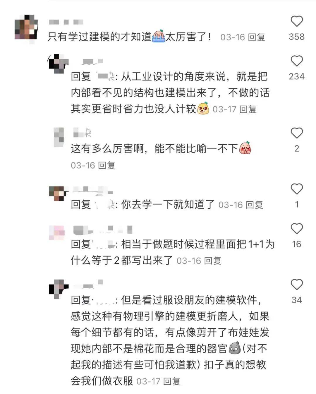 在社区讨论中,常常有人夸《以闪》建模有多细。学过建模的玩家会热情地向提问的玩家科普,说《以闪》相当于「在做题过程中把1+1为什么等于2都写出来」、「给棉花娃娃也做出器官」,感慨「真的想教会我们做衣服」。