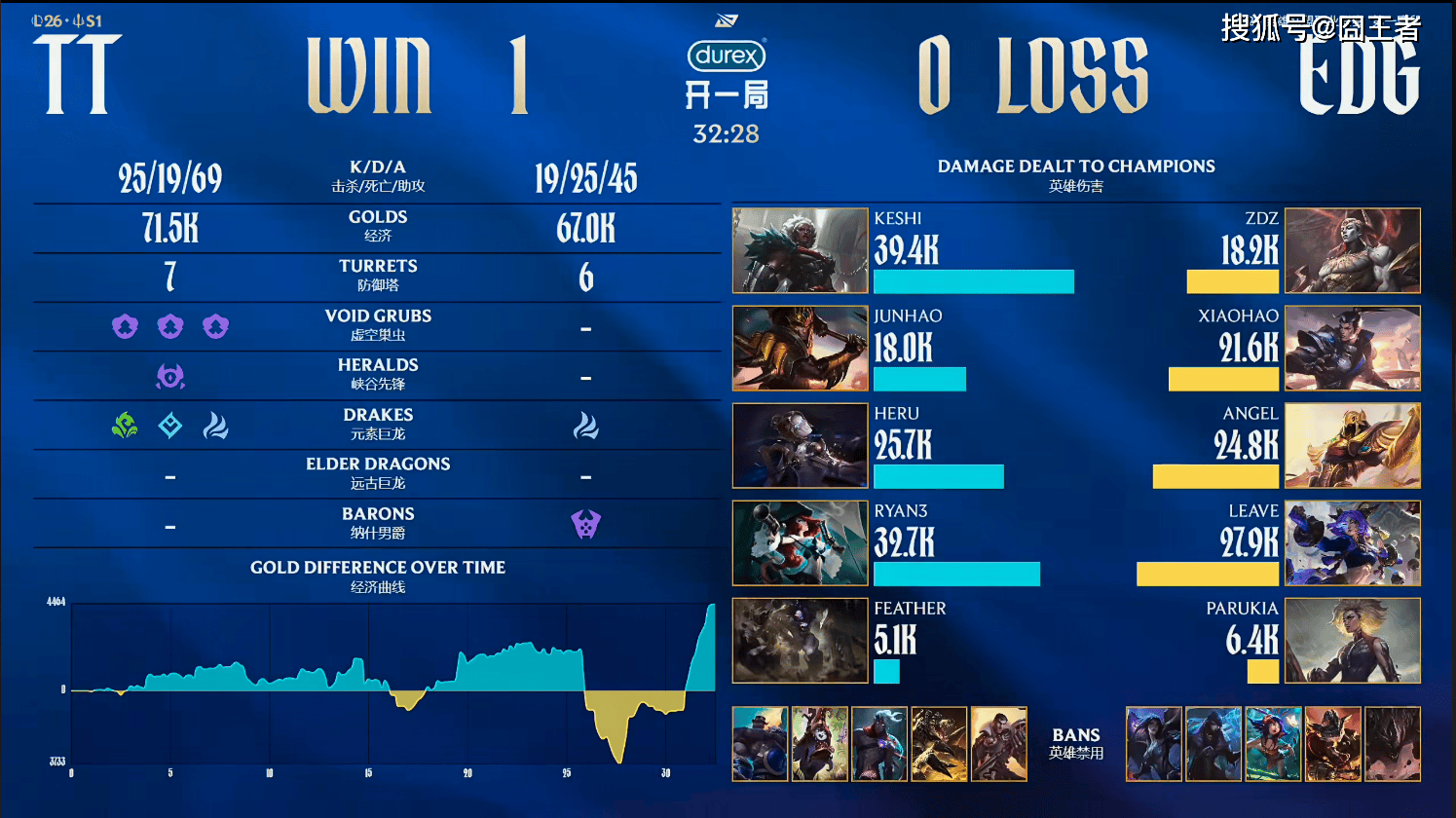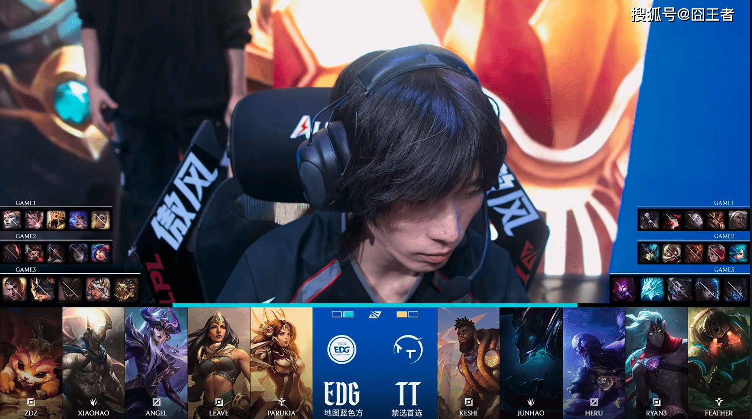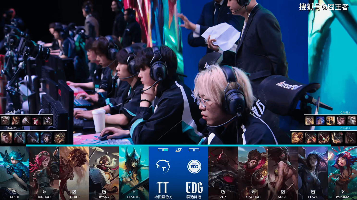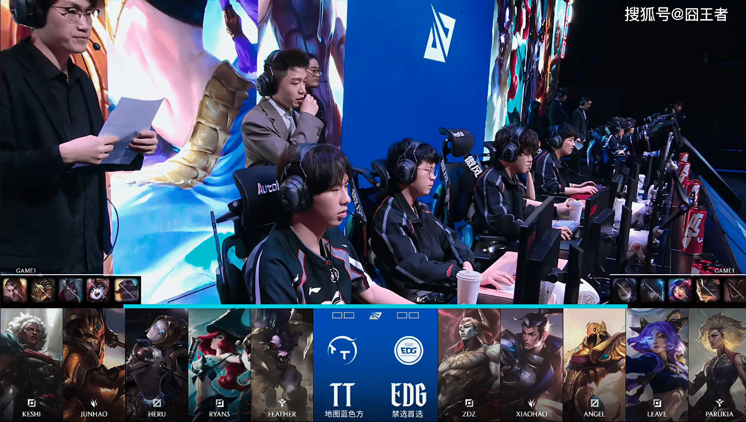 第一局比赛,TT蓝色方,禁用:杰斯,鳄鱼,韦鲁斯,璐璐,布隆,选用:Keshi狼母,Junhao皇子,Heru发条,Ryan3女枪,Feather牛头;EDG红色方,禁用:石头人,兰博,妮蔻,厄斐琉斯,卡莎,选用:ZDZ亚恒,Xiaohao赵信,Angel沙皇,Leave芸阿娜,Parukia芮尔