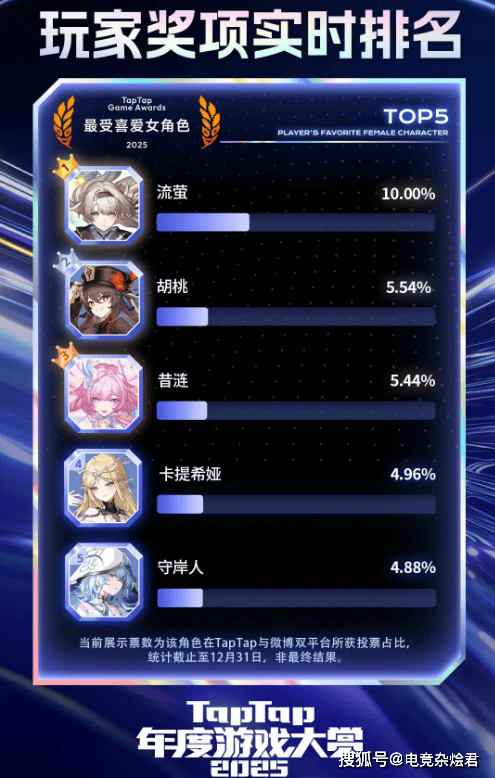 根据官方之前晒出的玩家奖项实时排名,可以看到流萤以绝对的票数压倒,稳居最受喜爱女角色第一席位。