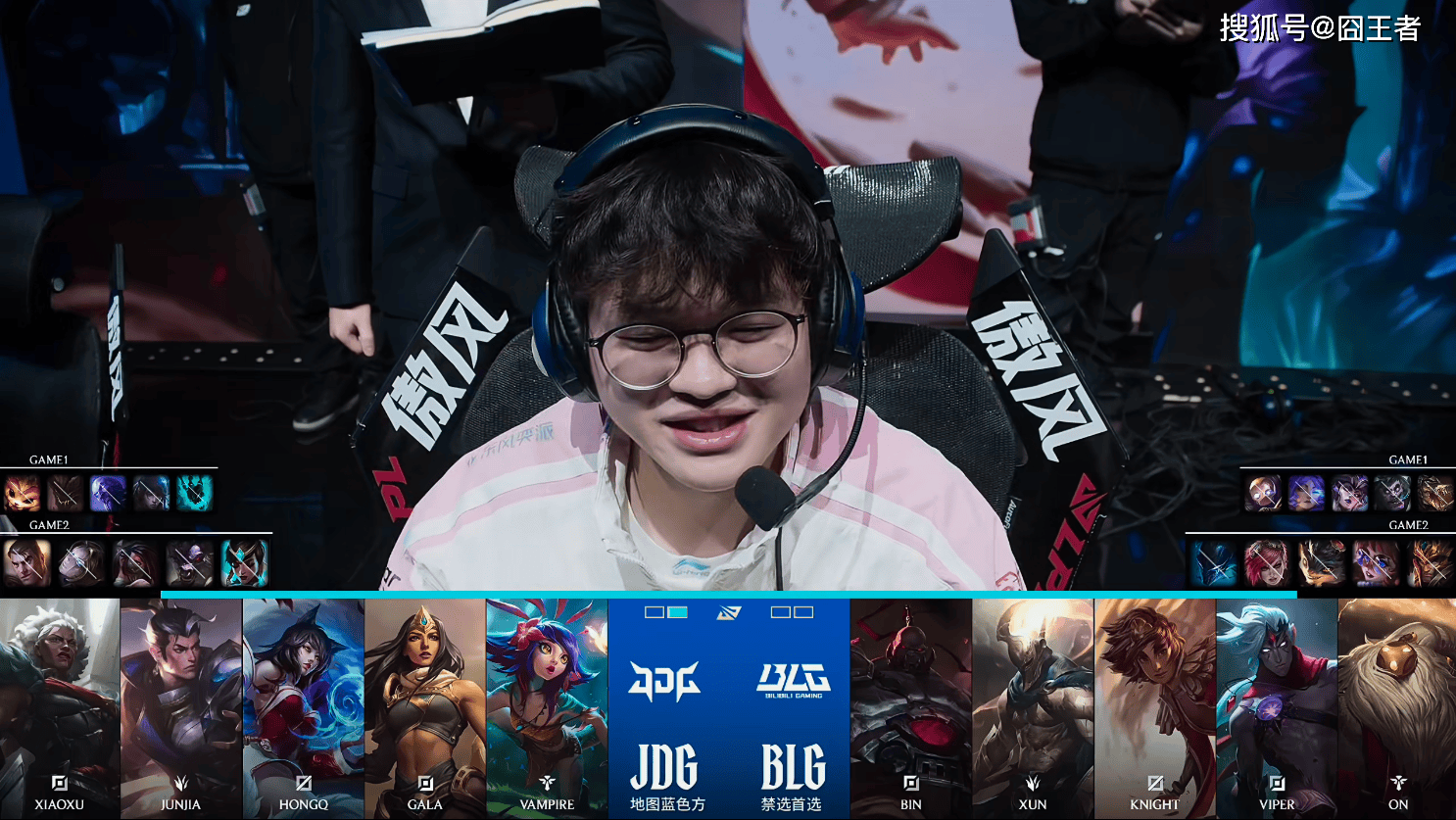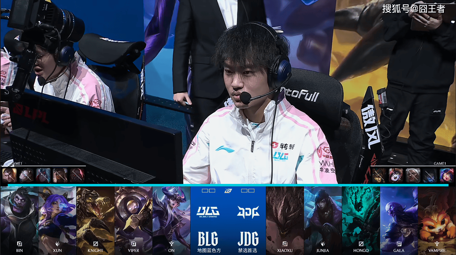 第一局比赛,BLG蓝色方,禁用:杰斯,发条,韦鲁斯,奎桑提,塞恩,选用:Bin鳄鱼,Xun蒙多,Knight辛德拉,Viper芸阿娜,On机器人;JDG红色方,禁用:妮蔻,塞拉斯,狼母,璐璐,蛇女,选用:Xiaoxu纳尔,Junjia石头人,HongQ瑞兹,Gala厄斐琉斯,Vampire锤石