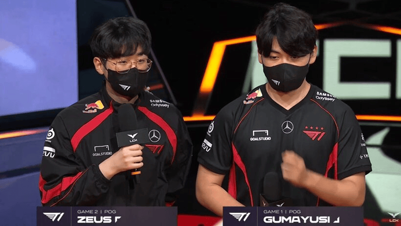 在8月11日的LCK夏季赛常规赛第二轮比赛中,T1战队以2-0的比分击败了BRO战队,他们尝试了很多新的英雄和战术,成功结束了之前的连败。赛后,本个系列赛的POG选手Zeus和Gumayusi,在舞台上接受了LCK主持人的采访,分享了他们对比赛的感受和对未来的展望。