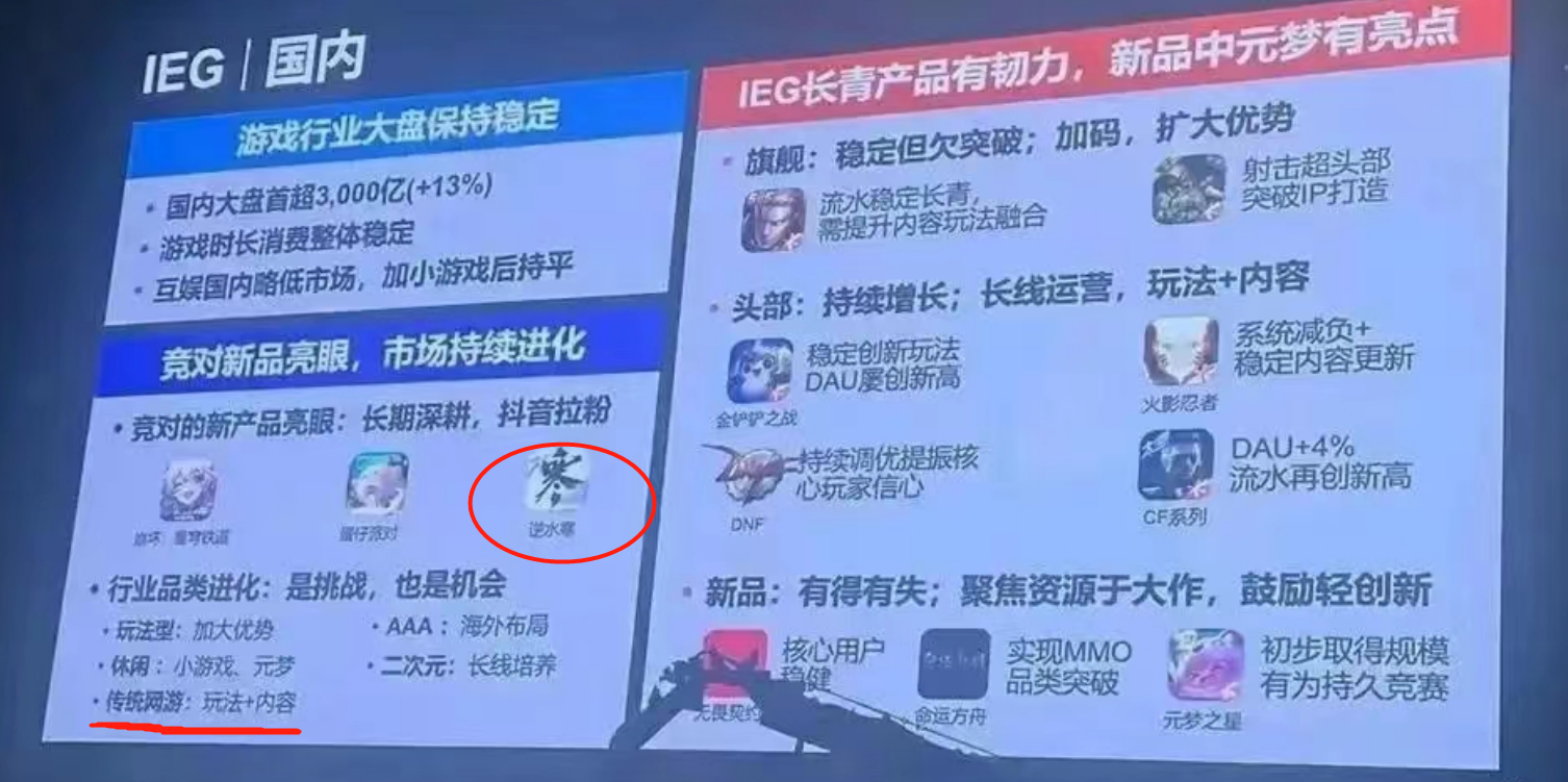 近日,一张图在业内疯传。大概是腾讯年底进行年度游戏复盘大会,其中在竞争对手那块,就出现了网易的《逆水寒》手游等游戏。