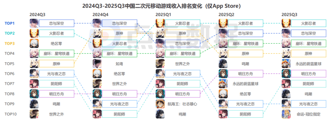 按照这个定义,只要是二次元美术风格加上抽卡机制,都可以归为二游。实际上,在一些行业统计中,也是这么做的。比如点点数据统计的二游收入排名变化,《恋与深空》《火影忍者》《原神》和《阴阳师》都被归为二游。