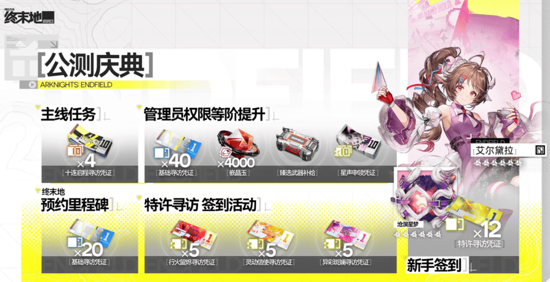 这种游戏系统设计上的复杂不完全是两种玩法结合的问题,还有《终末地》开发组的一些小巧思。比如抽卡系统,公测福利赠送的抽卡券多达7种,其中特许寻访的3种券其实就相当于对应限定池的免费抽卡次数。