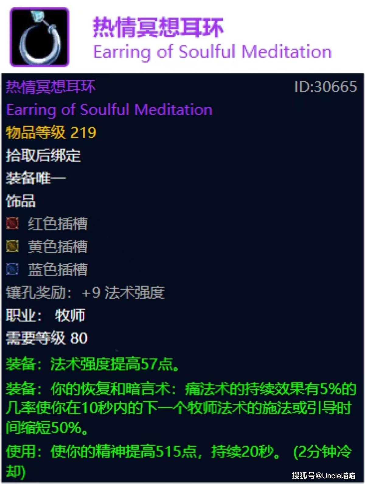 万年TBC版本的热情冥想耳环一起常驻稳定高额治疗效果和可控精神爆发成为神牧的无敌饰品,而今耳环的魔改可以说是让神牧和暗牧都心生向往的极品了,不仅常驻法强还有可控的高精神提高,最关键的是被动的施法或引导时间缩短50%,多目标丢恢复被动触发在线的话,那真的无敌了啊,至于暗牧喵叔玩的比较少,有懂行的兄弟也可以说一说该被动对于暗牧是否也同样恐怖如斯,整体来看,热情冥想耳环的这一波魔改同样和盘蛇饰带一样强势,值得期待!