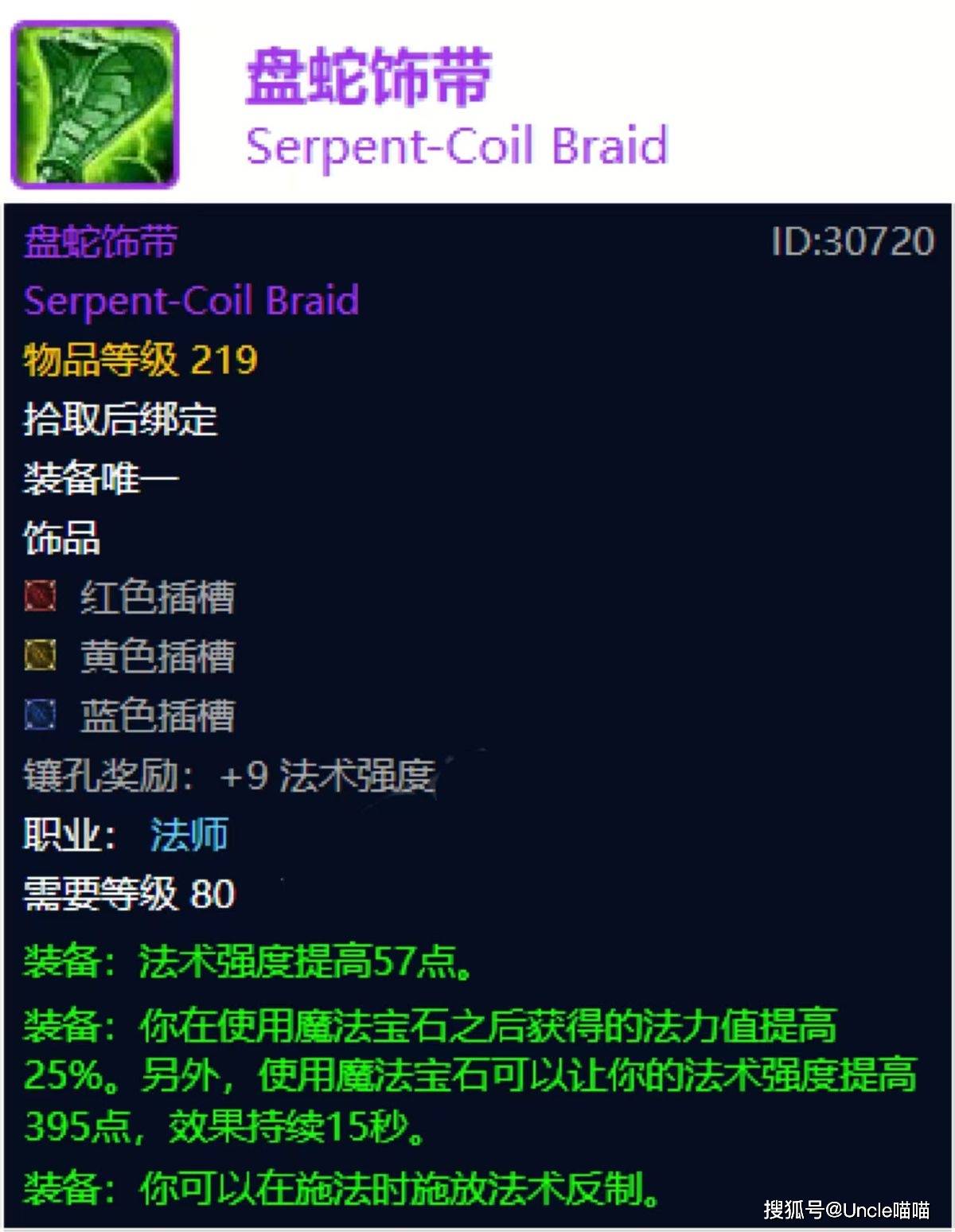目前魔兽世界时光服二阶段团本毒蛇神殿和风暴要塞也是即将开放,目前喵叔问了好多人,对于时光服和TBC周年服的选择,整体看来貌似还是时光服的人气更旺盛啊,虽然我个人还是偏爱TBC周年服,但是现实是残酷的,就是不知道TBC周年服实际开放后的情况了。回归正题,第一款毒蛇神殿职业专属饰品是法师的盘蛇饰带,原始版本的盘蛇饰带可以说是能够版本锁格子的存在,特别是对于奥法,而今的重铸,虽然说取消了法术命中与暴击,但是增设红黄蓝三插槽以及随心所欲的反制效果,只能说依旧是恐怖如斯直戳天花板的存在,虽然现阶段命中依旧是个问题,但是三插槽不是摆设,不夸张的说法师依旧是暴雪亲儿子职业无疑了,法师的话必须冲一波盘蛇饰带!