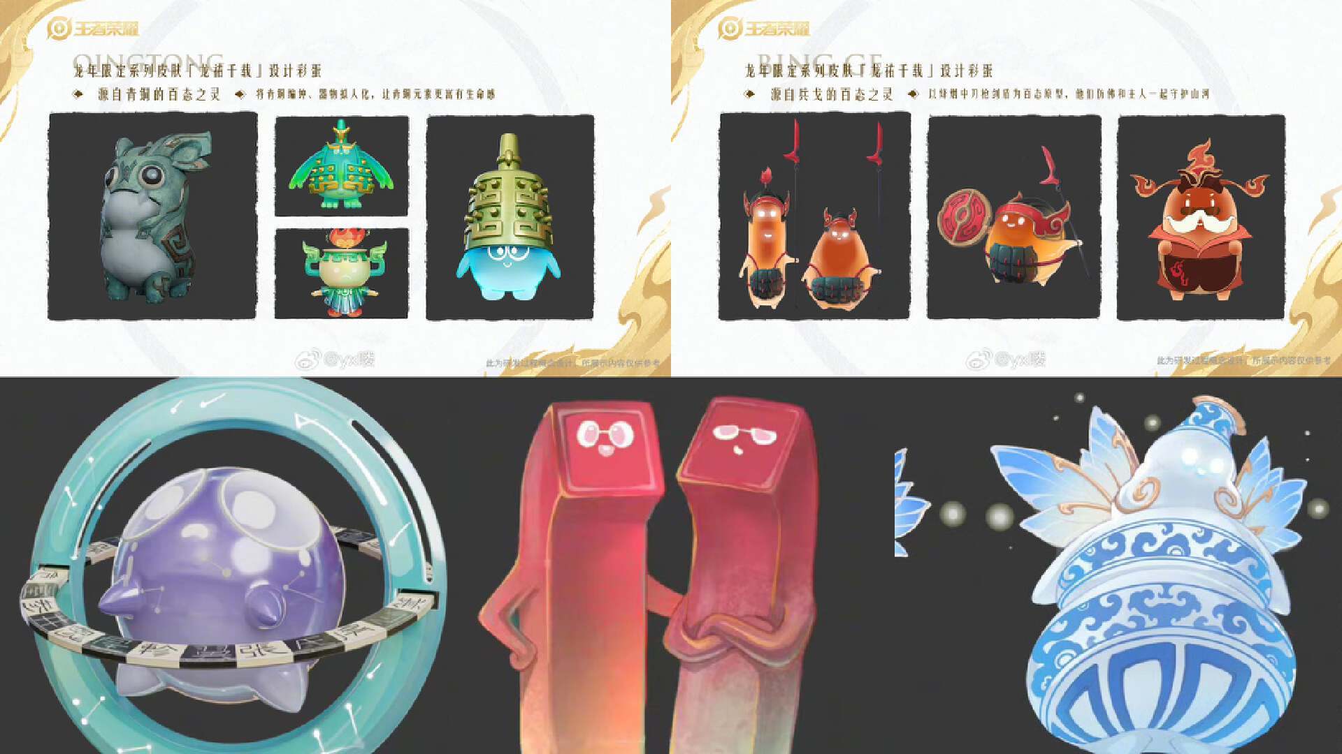 最后就是之前王者荣耀官方春节活动预告中提到的灵宠系统,很有可能就是说的上图的元素,因为这些元素也都是灵宠元素。所以有可能龙年限定皮肤每一款皮肤都对应的有1个灵宠,近期一共会推出5个灵宠。至于获取方式,很有可能需要点券购买,当然也有可能玩家入手年限皮肤,官方会直接赠送灵宠,具体是怎么安排的,还是需要看官方的具体排期。不过看上图的灵宠形象,也还是非常可爱的,如果获取方式不难,未来王者荣耀峡谷中灵宠也是满峡谷跑,想起来就挺有趣的。