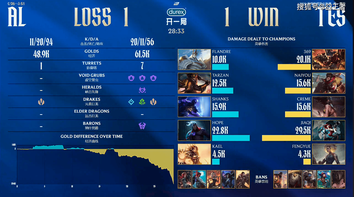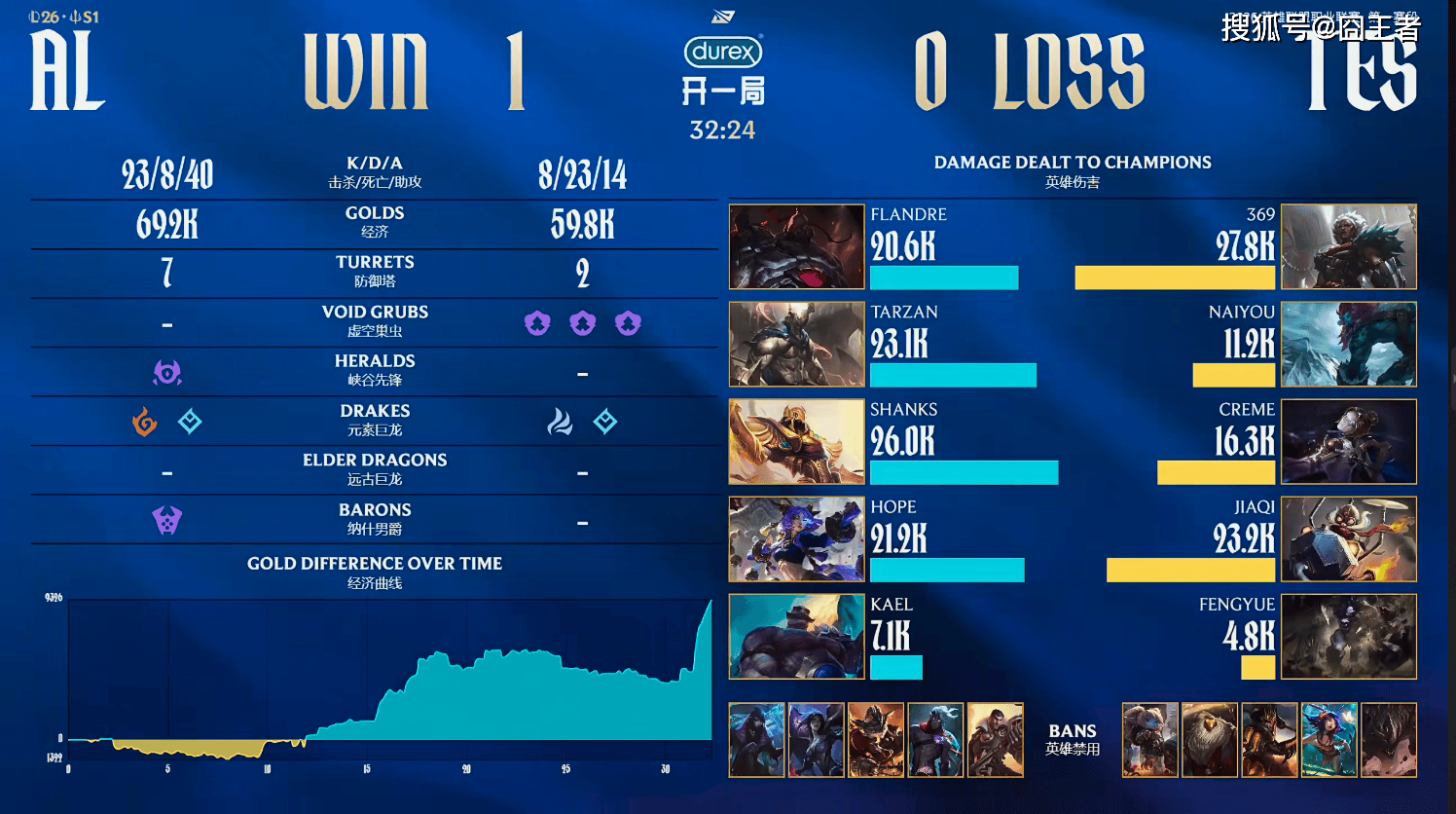 结果第一局比赛,TES在前10分钟,打了好局,可惜的是,后续事件,被AL拿捏了。2分钟左右:JiaQi飞机闪现线杀Hope芸阿娜拿到一血;9分钟左右:TES上野gank塞恩没打出击杀,潘森大招赶到收下双杀;11分钟左右:发条探草被蹲到,AL打出一换三;12分钟左右:AL野区留人再次打出一波一换三;16分钟左右:双方中路爆发团战,芸阿娜收掉巨魔后稳定输出打出一换四;17分钟左右:塞恩抓到机会下路单杀狼母;最终32分24秒:双方河道爆发团战,AL保住芸阿娜无解输出,打出一换五团灭对手后,一波结束比赛。