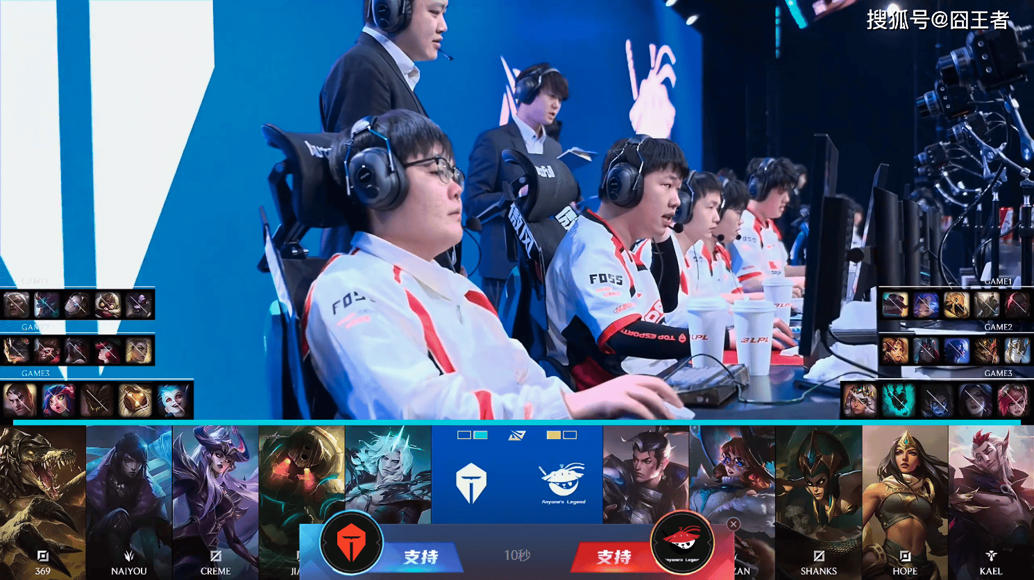 第三局比赛,TES蓝色方,禁用:杰斯,妮蔻,石头人,巴德,金克丝,选用:369鳄鱼,Naiyou佛耶戈,Creme辛德拉,JiaQi厄斐琉斯,Fengyue泰坦;AL红色方,禁用:蔚,卡莎,塞拉斯,锤石,琪亚娜,选用:Flandre阿萝拉,Tarzan赵信,Shanks蛇女,Hope希维尔,Kael洛