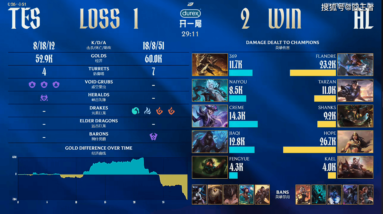 第二局比赛,AL蓝色方,禁用:杰斯,卡莎,琪亚娜,永恩,蔚,选用:Flandre加里奥,Tarzan皇子,Shanks瑞兹,Hope韦鲁斯,Kael曙光;TES红色方,禁用:石头人,妮蔻,奎桑提,巴德,波比,选用:369兰博,Naiyou猴子,Creme阿卡丽,JiaQi女枪,Fengyue芮尔