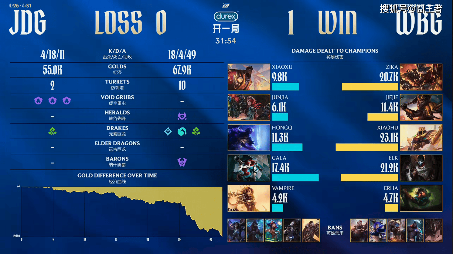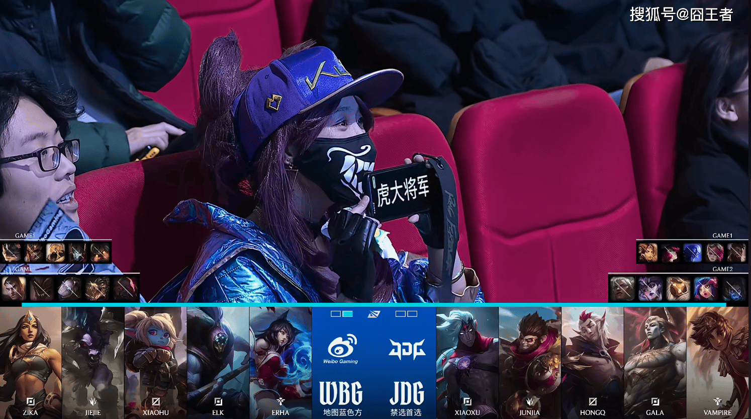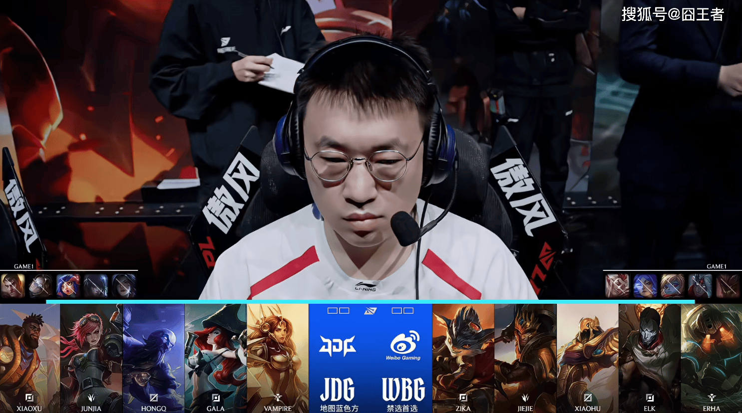 第一局比赛,WBG蓝色方,禁用:杰斯,石头人,发条,鳄鱼,塞恩,选用:Zika武器,Jiejie波比,Xiaohu阿狸,Elk希维尔,Erha牛头;JDG红色方,禁用:塞拉斯,妮蔻,巴德,辛德拉,狼母,选用:Xiaoxu亚恒,Junjia猴子,HongQ岩雀,Gala韦鲁斯,Vampire洛