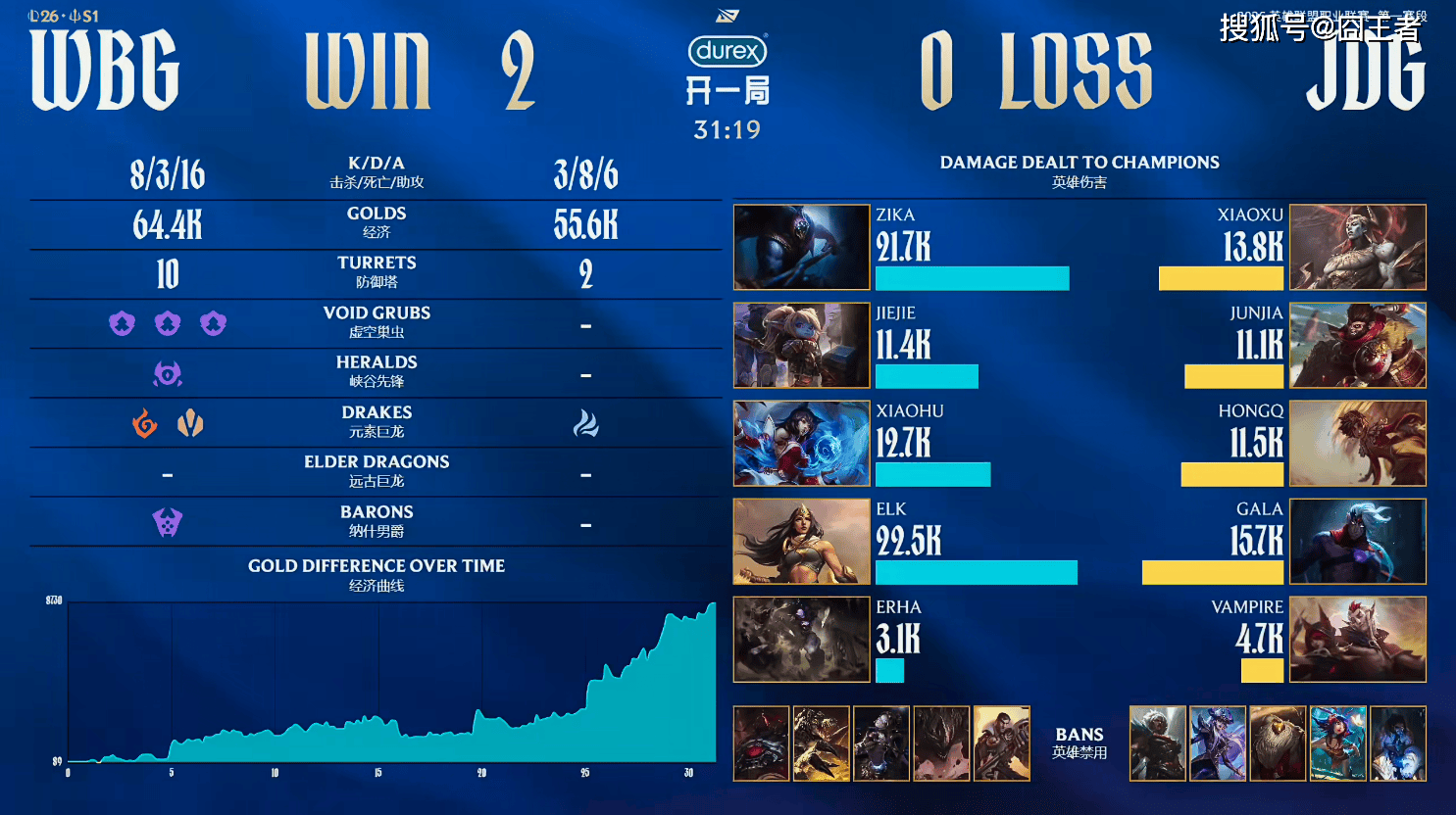 结果第二局比赛,又被WBG打出了碾压局,这怎么搞?4分钟左右:Erha牛头绕后顶回GALA,GALA闪现撞墙送出一血;15分钟左右:Jiejie波比过于恋战被对方支援包围,HongQ拿到终结;25分钟左右:HongQ岩雀开大被牛头击落,Zika武器拿下双杀WBG拿到大龙;27分钟左右:Xiaohu阿狸脱节被控到送出人头;最终31分19秒:WBG推上高地强拆一波结束比赛