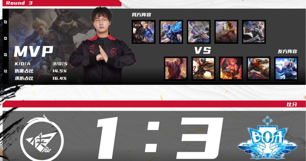 之后BOA中路逼团,RW花云老夫子大招捆住昊然的凯,奈何凯的经济太好,RW无法击杀。结果被BOA抓住机会反打,阵型直接被打散。第二局,RW中单晨风因为意识问题被BOA射手小瞳在草丛埋伏成功,送出人头。比赛来到后期,中路爆发团战,Fly找到机会,夏洛特弱化大招进场击飞三人,本以为能团灭BOA。却不曾想队友没有注意到小瞳公孙离伞的位置。结果小瞳公孙离回伞反打,RW直接被团灭。
