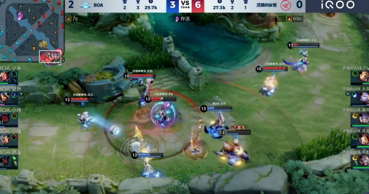 第三局比赛可以说是Fly和无双两个人的战场。先是游戏前期,二人配合留住BOA四人。Fly狂铁闪现进场击杀掉了BOA小伟,然后配合队友打出0换3,拿到优势。游戏后期的暴君团战,Fly绕后找到BOA小伟的位置,最终RW顺利打出团灭,奠定比赛胜利。