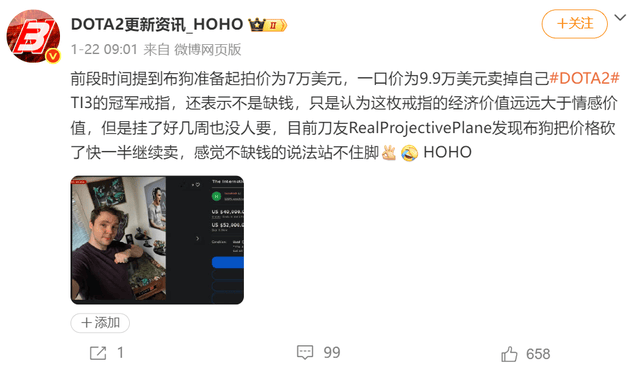 然而,让人意外的是TI3冠军A队的三号位Bulldog前不久被网友发现在海外电商平台拍卖自己的TI冠军戒指。这样一个具有纪念意义的物品拿出来卖,有网友猜测可能是Bulldog经济状况有些问题,或者是由什么难言之隐。然而距离这枚冠军戒指被挂拍卖已经过去几周时间,却还是无人问津。