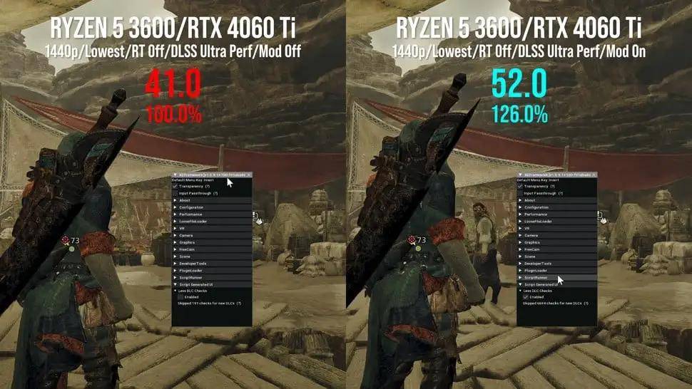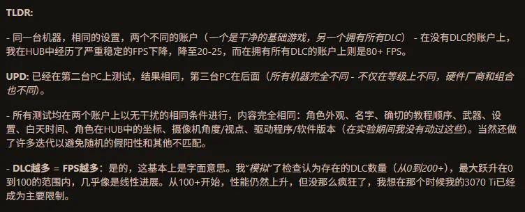 为了证明这个观点“de_Tylmarande”制作了一个小Mod,通过一些技术手段让游戏系统相信自己有特定数量的DLC。最终发现,测试PC上的确出现了DLC数量越多、帧数越高的情况。