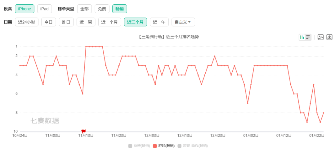 从榜单上看,《三角洲行动》过去一年的统治力更加直观。据七麦数据显示,2025年下半年,《三角洲行动》从未跌出过iOS游戏免费榜Top 5,近三个月里也始终保持在游戏畅销榜Top 10以内。