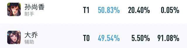 最重要的是,孙尚香和大乔的热度实在是太高了,在巅峰赛里,孙尚香的出场率高达20.4%,而大乔的BP则是96.58%,优先级能排到各自分路的前三名。
