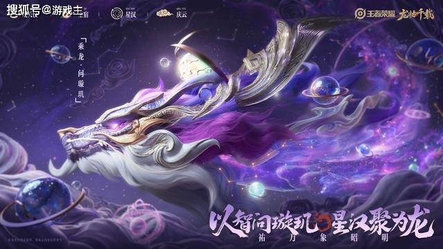 以上则是皮肤的海报,主色调是代表对星辰宇宙和浩瀚苍穹的暮山紫,服饰则围绕着祥云和璀璨星辰进行设计。