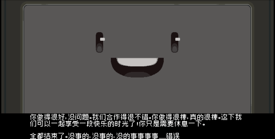 从出发点来看,BeMK 对绝对安全的执着确实符合其编程初衷:它以短时循环、严密的监控机制确保连接者不受外界伤害,同时,借由无间断的感官反馈、持续更新的场景切换,将痛苦降至零,让连接者在幸福乐园(由于玩家打开“_100.bat”时,Centum 早已崩溃,所以幸福乐园并不是第一章的石砖屋,更类似第二章的游乐场)中获得近乎神话般的抚慰。BeMK 将“灾难的消除”定义为系统运转的最终目标,在代表 ZX AUQA 公司的角色“无脸官员”的协助下,向玩家与数字化民众反复灌输“此处即是终极安乐”的信条。