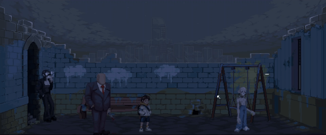 最初注意到《Centum》时,我就沉迷于它的像素图像不可自拔。游戏整体采用 80 年代胶片电影的颗粒质感和阴影遮罩,通过主题调性极其统一的高级灰调和大量惊悚黑暗的造型,描绘出一幅幅兼具恐惧、怀旧、焦虑、迷失等心理印象的情绪化插图。于是,游戏发售后,我便在其中投入了大量时间。