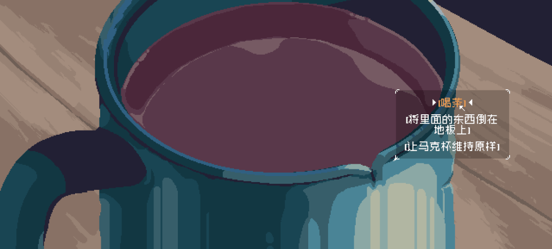 有几个值得注意的细节:门外的朋友和老鼠只会在晚上出现,同时晚上大多数交互行为都会被限制;法官让玩家做的事——喝茶、饮血肉,以及法官相关事件会在固定天数刷新,与玩家的选择无关;文本方面,玩家面对的分支选项有五个模糊的倾向,当做出一些重要选择或累积了一定量的同类选择后,法官的形象会发生变化,也会有名为“AI”的旁白表示“钓鱼小屋:有可用的更新”。