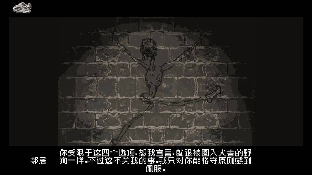 虽然墙壁的骷髅涂鸦说你受限于四个选项,但其实每次带有身份倾向的可选分支选项均有五个。另外那一个——“预设”,总是表达出一种“一切没有意义”的态度
