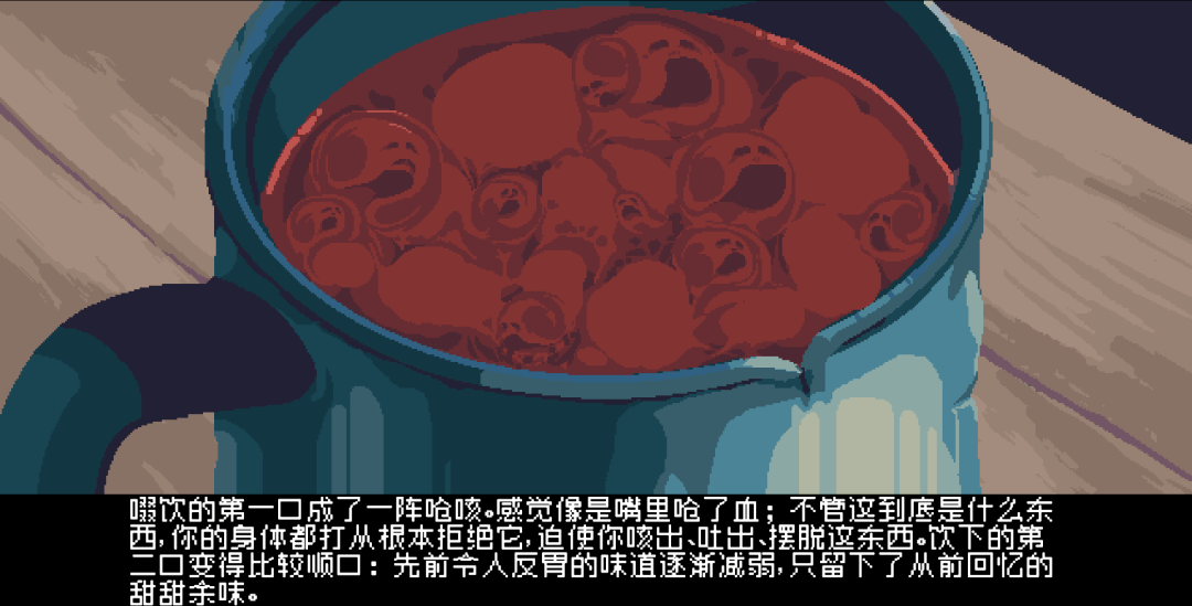 五大身份的相关剧情也是解读《Centum》精彩群像剧中各种象征符号的关键。比如“杀人犯”的人格戴斯摩德在战后精神失常,会在心里把血和水倒置,只有杀人饮血才能止渴。第一章则有与之相呼应的物件:茶水和血肉组成的血茶水。当玩家喝下它之后,会回忆起某些事情,而回忆则最终指向了“黑水河”这一 BeMK 冗余数据的集合,完善了 Centum 世界中虚拟和现实边界的设定。
