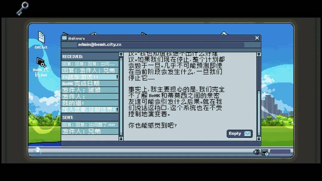 在剧情正式开始前,玩家会在没有任何提示的情况下,打开一个类似古早计算机的界面。阅读几个文件后,可以得知以下信息:玩家只有三天时间,要在这台(全世界唯一一台)电脑中探索 AI 程序,但任务尚不明确。