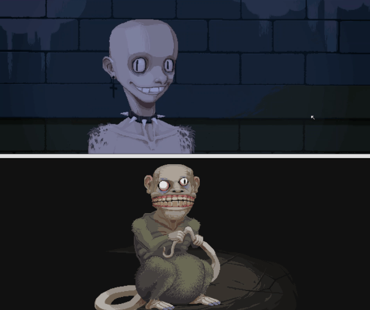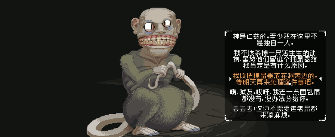 游戏第一章设计了一个表面上拥有多种分支选择,实则剧情相对固定的“三日逃脱”循环结构。五头法官每一次都用“你是谁?”“你做了什么?”“你要接受审判”这样的固定开场将玩家置于不确定的困境中,却对揭开困境的答案避而不谈。除了解谜内容以外,系统从头到尾都不会告诉玩家做出的分支选择会导向什么结果,最多只是会让你知道选择已经被记录。玩家又要在每天夜晚和老鼠、“朋友”、墙上的骷髅涂鸦对话,在模糊的文本中猜测游戏到底想表达什么。这等同于一种“设定性否定”,使玩家得到的反馈愈加负面。