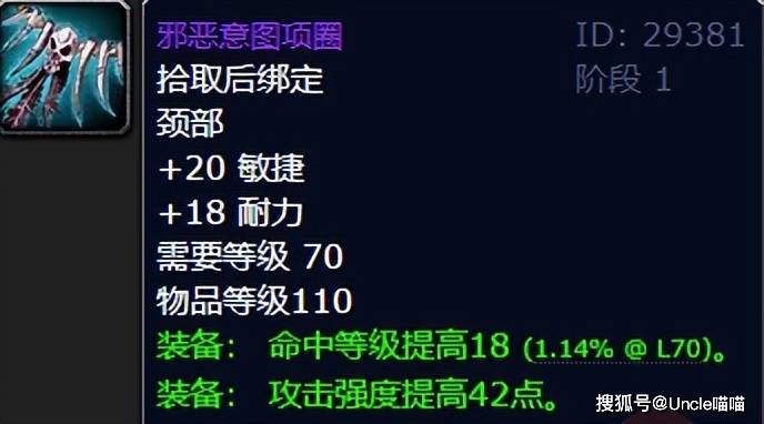 第七席位,就是前期所有物理系输出大兄弟必入的牌子项链邪恶意图项圈了,高敏捷、带命中还有不俗的攻击强度,简直无懈可击,就算是狂暴战也得闭眼入,可以说是嗜血胸针后的第二款必入牌子装了,必须恐怖如斯!