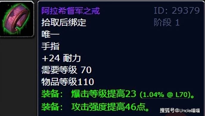对于这款属性只有耐力的爆击攻强戒指,喵叔是推荐给大战神狂暴战的,可以想象,现在这个魔兽世界,狂暴战绝对是金团的主力玩家了,而基本上都是冲着体验输出去的,那么初期团本前你的两枚戒指必然有阿拉希督军之戒一席之地,另一枚的话毫无疑问就是贫民窟声望崇拜的变形者徽记了。不过话说狂暴战这个职业真的是金币消耗者无疑,初期一套高端装备不是花金币购入就是要花金币锻造,太难了!