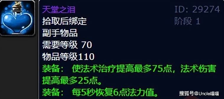 另外既然说到治疗了,那么属性全无绿字非常极品的天堂之泪就推荐给各位吧,这东西不夸张的说就算是包括奶萨在的治疗团本前最强副手了,75点的法术治疗提高着实恐怖如斯直戳天花板!