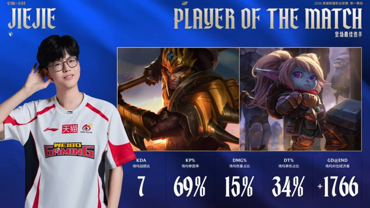 另外的一个对位羁绊就是Jiejie与Junjia,两人之前都在EDG效力过,不知道是不是因为这个原因,导致Jiejie也爆发了,第一局的皇子串联全队,带动三路节奏打出优势,第二局选出波比依旧发挥出色,直接斩获了全场比赛的MVP。